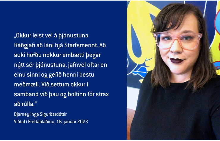 Sýslumenn eru meðal þeirra stofnana sem hafa nýtt sér Ráðgjafa að láni og hefur samstarfið gengið vonum framar að sögn Bjarneyjar Ingu Sigurðardóttur, ábyrgðaraðila fræðslumála hjá sýslumönnum sem Fréttablaðið tók viðtal við í síðasta mánuði. „Framtíðarsýn Sýslumanna er að veita framúrskarandi þjónustu óháð búsetu og staðsetningu hvar og hvenær sem er og hafa Sýslumenn sett sér það markmið að vera leiðandi í rafrænni þjónustu. Sú vegferð þýðir það að við þurfum að aðlaga okkur breyttum tímum.“