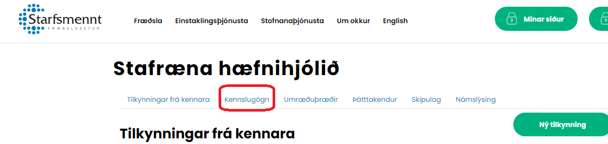 Þegar þú hefur skráð þig inn á Mínar síður á vef Starfsmenntar og ferð í Námskeiðin mín og smellir á eitt námskeið, þá birtist stika fyrir ofan heiti námskeiðsins og eitt af efnisorðunum er Kennslugögn. Þar finnurðu glærur og annað efni af námskeiðinu.
